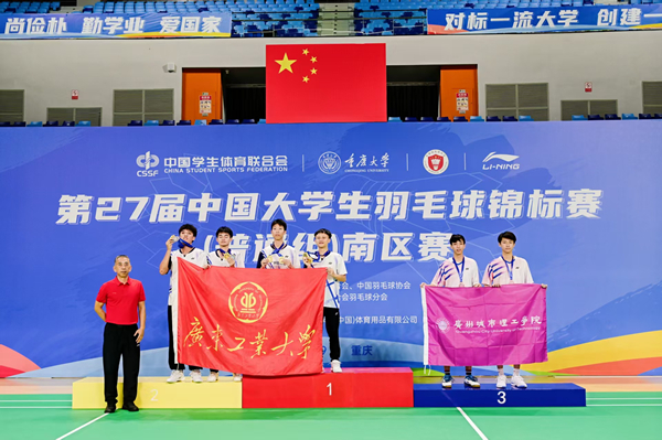 9月26日,第27届中国大学生羽毛球锦标赛普通组(南区赛)在重庆大学圆满落幕,本次赛事吸引了南区包括复旦大学、华中科技大学和中山大学等44所高校的316名运动员参加。我校羽毛球队奋勇拼搏,表现卓越,朱健民和刘博深联手历史性地斩获男子双打项目铜牌,实现了学校在该项国家级赛事中奖牌零的突破,队员程朗亦荣获男子单打第六名。我校参赛的四个单项全部晋级全国总决赛。